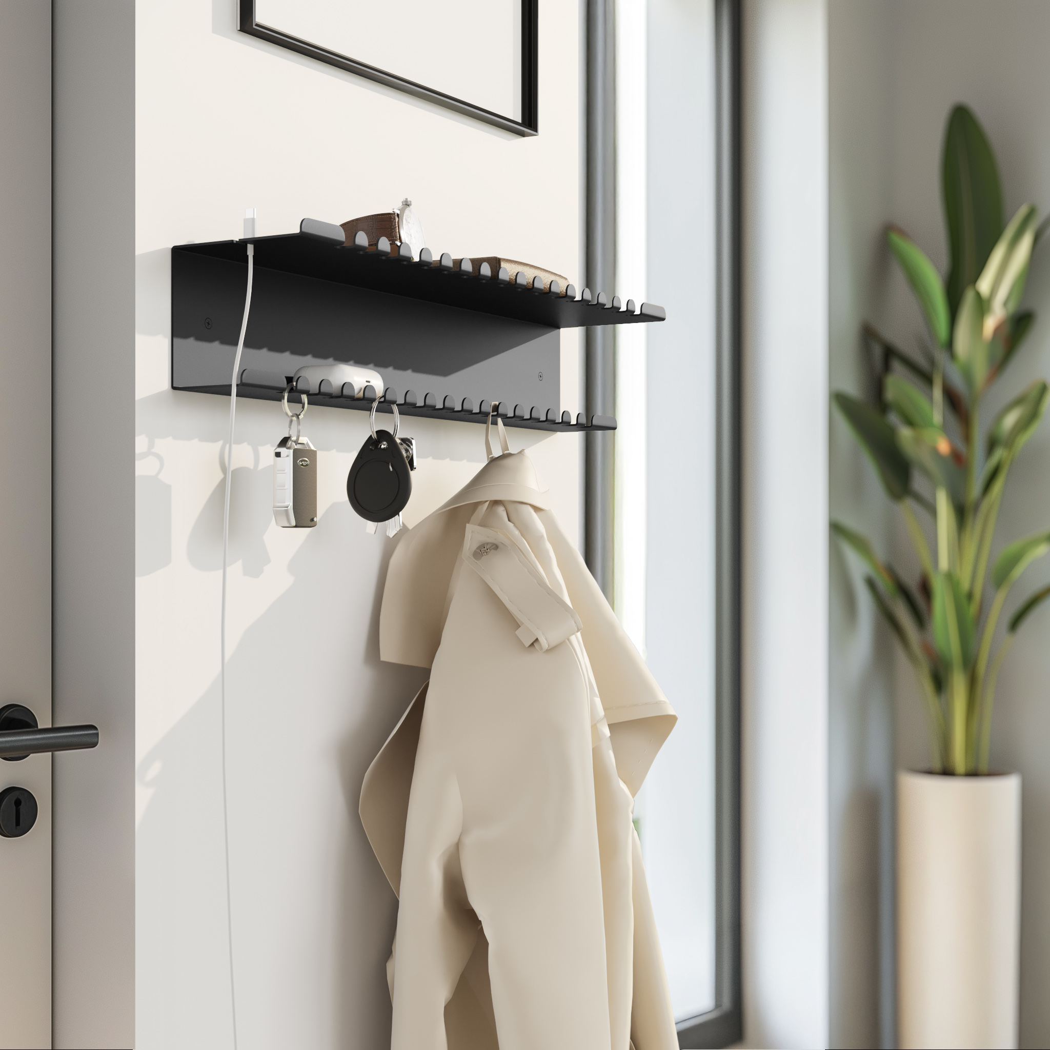 Półka posiada aż 32 haczyki, na których możesz zawiesić klucze, narzędzia czy biżuterię. Półka sprawdzi się jako miejsce na pocztę, telefon i inne drobne przedmioty. Idealnie nadaje się do powieszenia przy drzwiach wejściowych, w korytarzu, kuchni, łazienki lub pokoju nastolatków.
